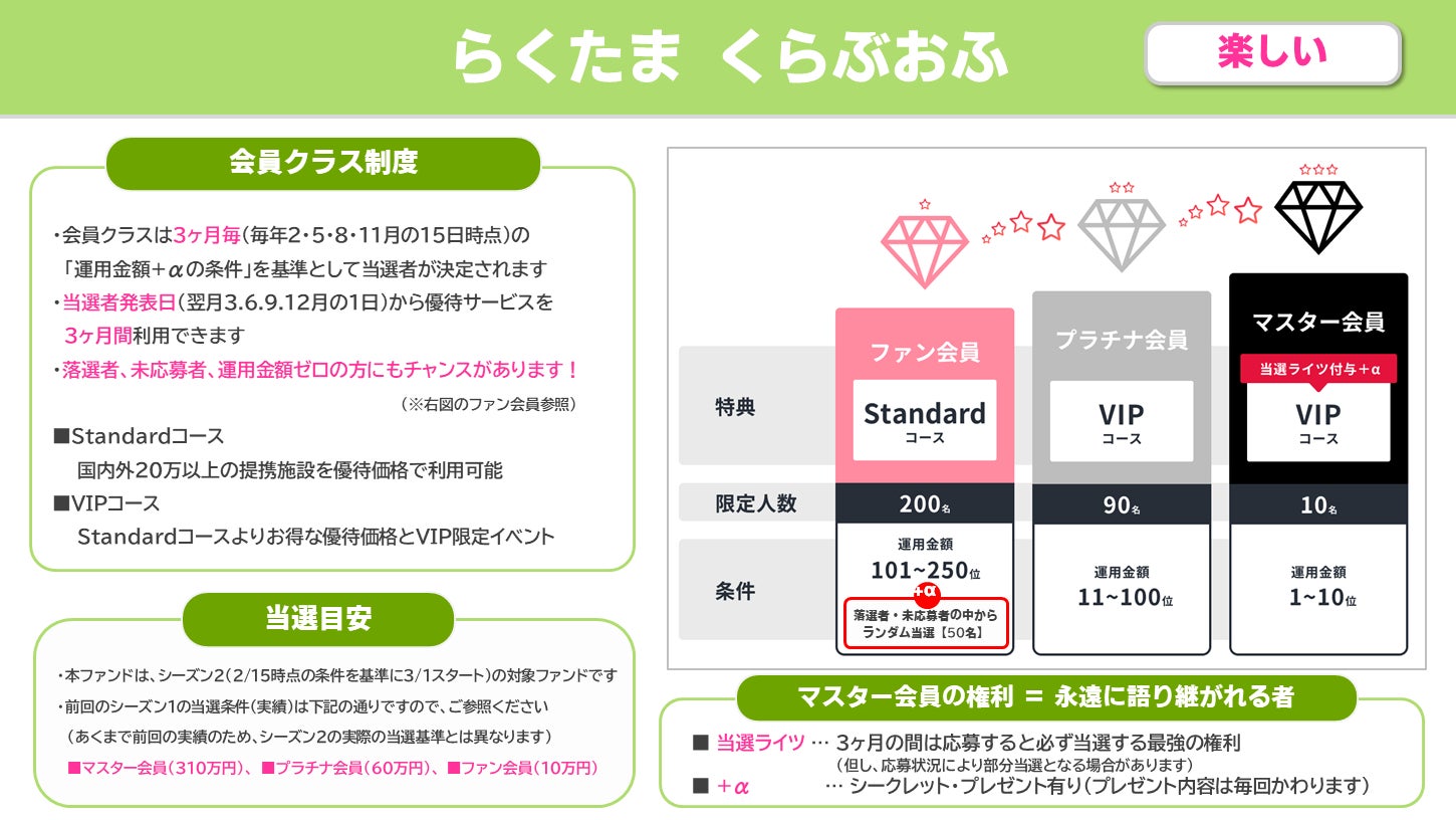 本日公開した6ファンドへの投資額は「らくたま くらぶおふ」(2025年3月1日=シーズン2)の参加基準となる2月15日時点の運用金額に合算されます。魅力的な特典が満載の「らくたま くらぶおふ」にぜひご参加ください。詳細はこちらのPDF資料「らくたまWORLD資料(新しい冒険をはじめよう!)」をご確認ください。