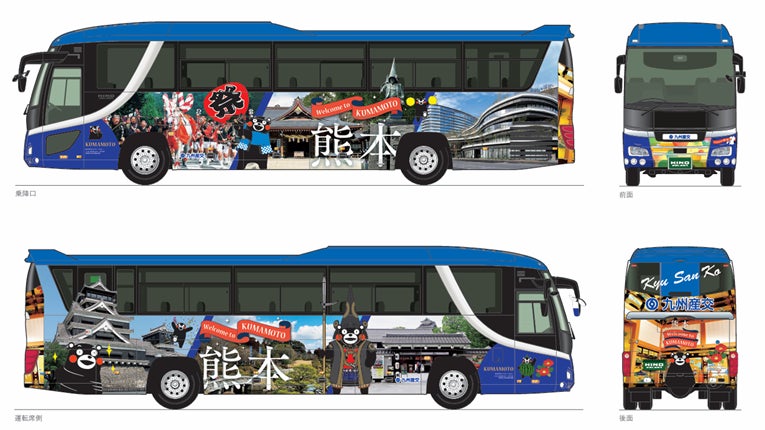 熊本県の熊本地域、山鹿・菊池地域、阿蘇・南阿蘇地域、天草地域及び人吉・球磨地域の5地域の観光地や地域の文化等を表現した、くまモンラッピングデザイン貸切バスをラインナップ。