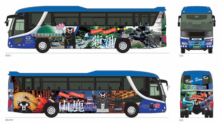 今回は、熊本県の熊本地域、山鹿・菊池地域、阿蘇・南阿蘇地域、天草地域及び人吉・球磨地域の5地域の観光地や地域の文化等を表現したくまモンラッピングデザイン貸切バスをラインナップ。