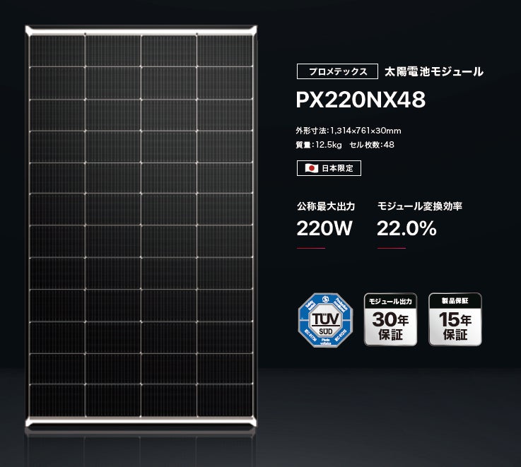 株式会社プロメテックスホールディングス(本社:愛知県、代表取締役:江中健一)は、積雪地域等に対応可能な耐久性・意匠性・高効率を兼ね備えた太陽光発電パネル 「PX220NX48」 を10月15日より発売いたします。当社はこれまでも積雪地域における住宅用太陽光発電の普及と品質向上に力を注いできました。今回の新製品は、厳しい気候条件にも耐え得る耐久性と、高い発電効率、そして住宅屋根との調和を両立させています。