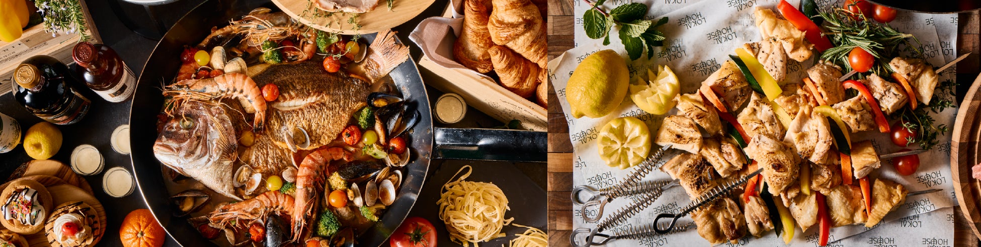 食欲をそそるメイン料理には、新鮮な真鯛やエビ、ムール貝の旨味が凝縮されたアクアパッツァをはじめ、とろけるような舌触りの低温熟成ローストビーフや、大阪の串料理文化をLOKAL HOUSEならではの解釈で仕上げた、香り豊かな鶏もも肉の串グリルなどがテーブルを彩ります。