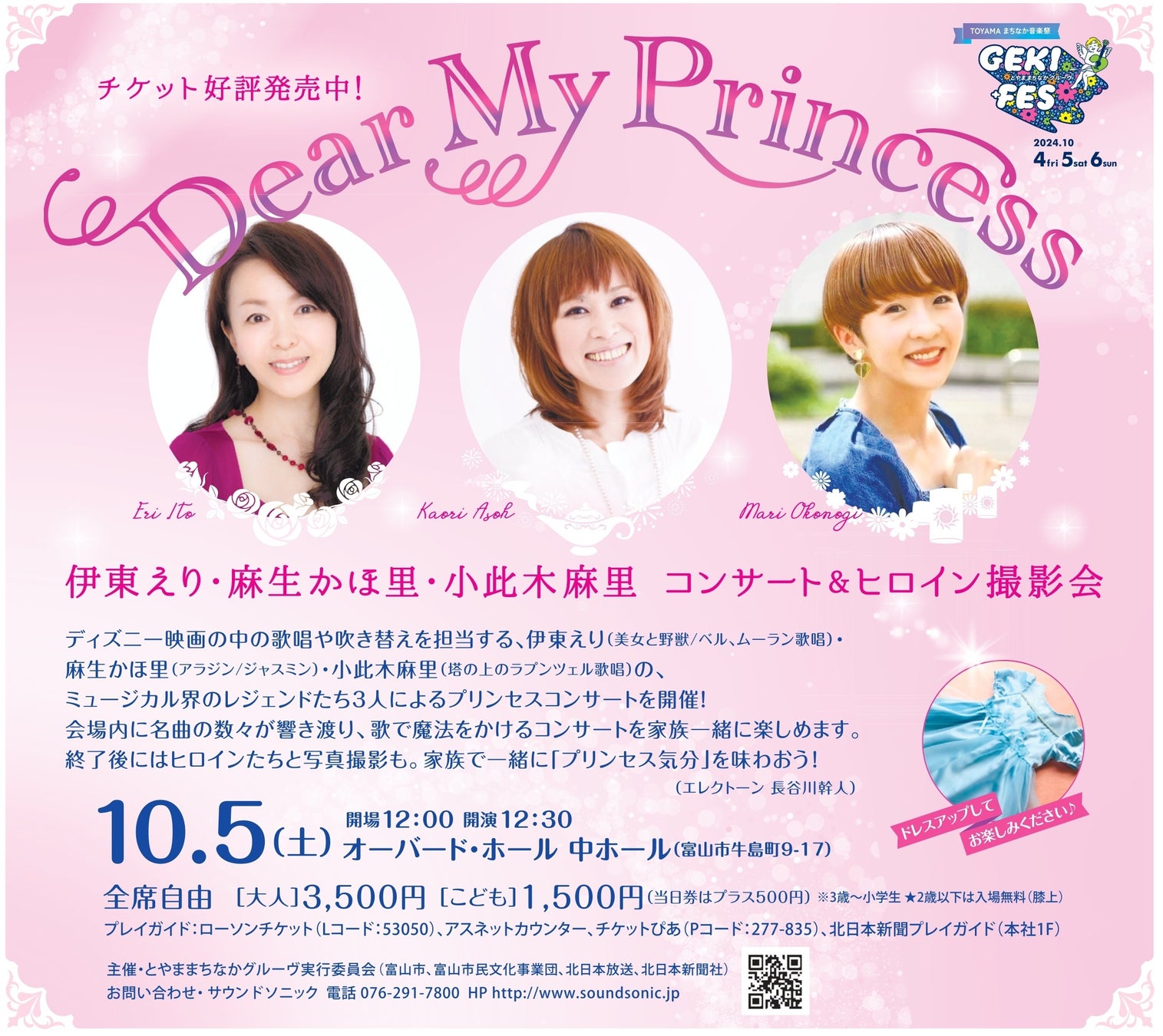 株式会社北日本新聞社(本社:富山市)などでつくるとやままちなかグルーヴ実行委員会は、10月5日にオーバード・ホール/大ホールで、「Dear My Princess」伊東えり・麻生かほ里・小此木麻里コンサート&ヒロイン撮影会を開催します。