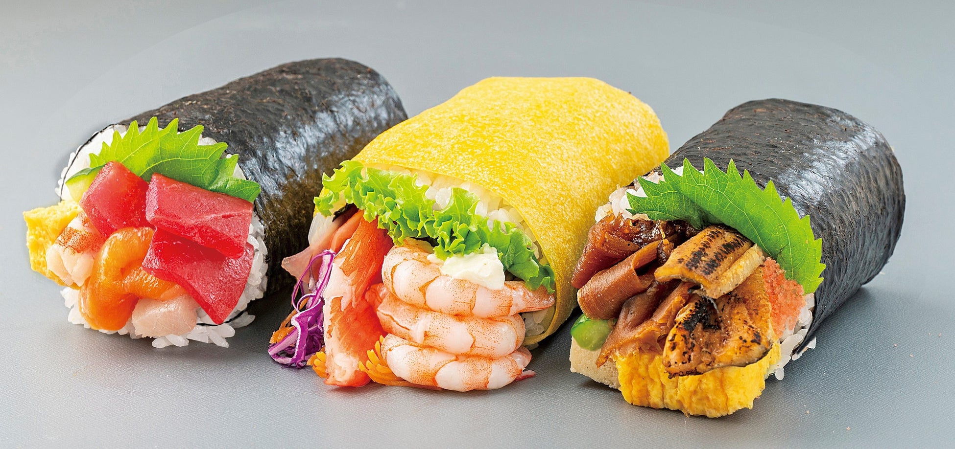 海鮮笑福巻、海老のクリームチーズロール、国産焼き穴子の恵方巻の3種類の巻寿司