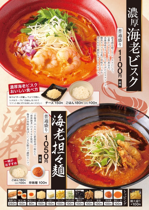 株式会社キタカタ(本社:新潟県新潟市)が新潟市内に2店舗展開する、らーめん店「風伯(ふうはく)」は、過去に期間限定メニューとして販売し、女性を中心に多くのお客様からご好評をいただいた『濃厚海老ビスク』と『海老担々麺』の2品を、2024年10月1日(火)より定番メニューとして発売します。