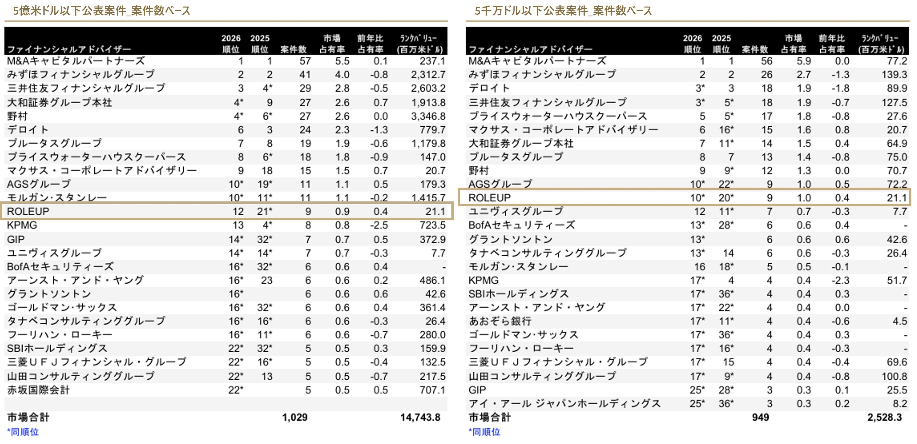 【株式会社ROLEUP】M&Aリーグテーブル「中規模市場 日本M&Aレビュー2026年 第1四半期」にて、5億米ドル以下公表案件数ベース12位、5千万ドル以下公表案件数ベース10位にランクイン