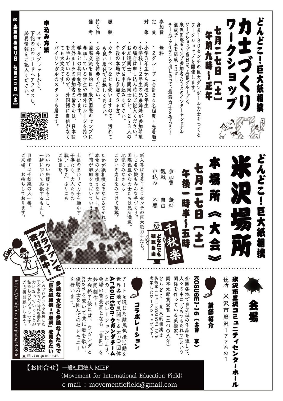 難民や避難民の背景をもつ子ども達、地元米沢の子ども達、国際キャンプ参加者が混成チームを編成し、身長180センチの巨大ダンボール力士を制作します。午前中に制作ワークショップを実施後、午後には制作した力士たち同士を巨大な土俵の上で戦わせ、優勝を目指すトーナメント戦を行います。本イベントの中では、米沢市内の相撲教室の方々による「みんなで一緒に四股ふんでみよう! 四股ふみ体験!!」、さらには、アートを通じた難民包摂活動を世界各地で展開するNPO団体Artolution・ウガンダチームとのコラボレーションによる相撲大会の背景となる「書割」の共同制作などで、会場を盛り上げます。大会終了後には、ウガンダとzoomを繋いで共に歌を歌い、優勝力士を囲んでのセレモニーを行います。