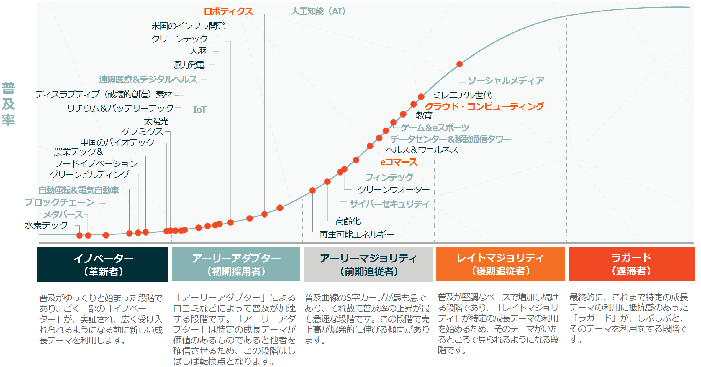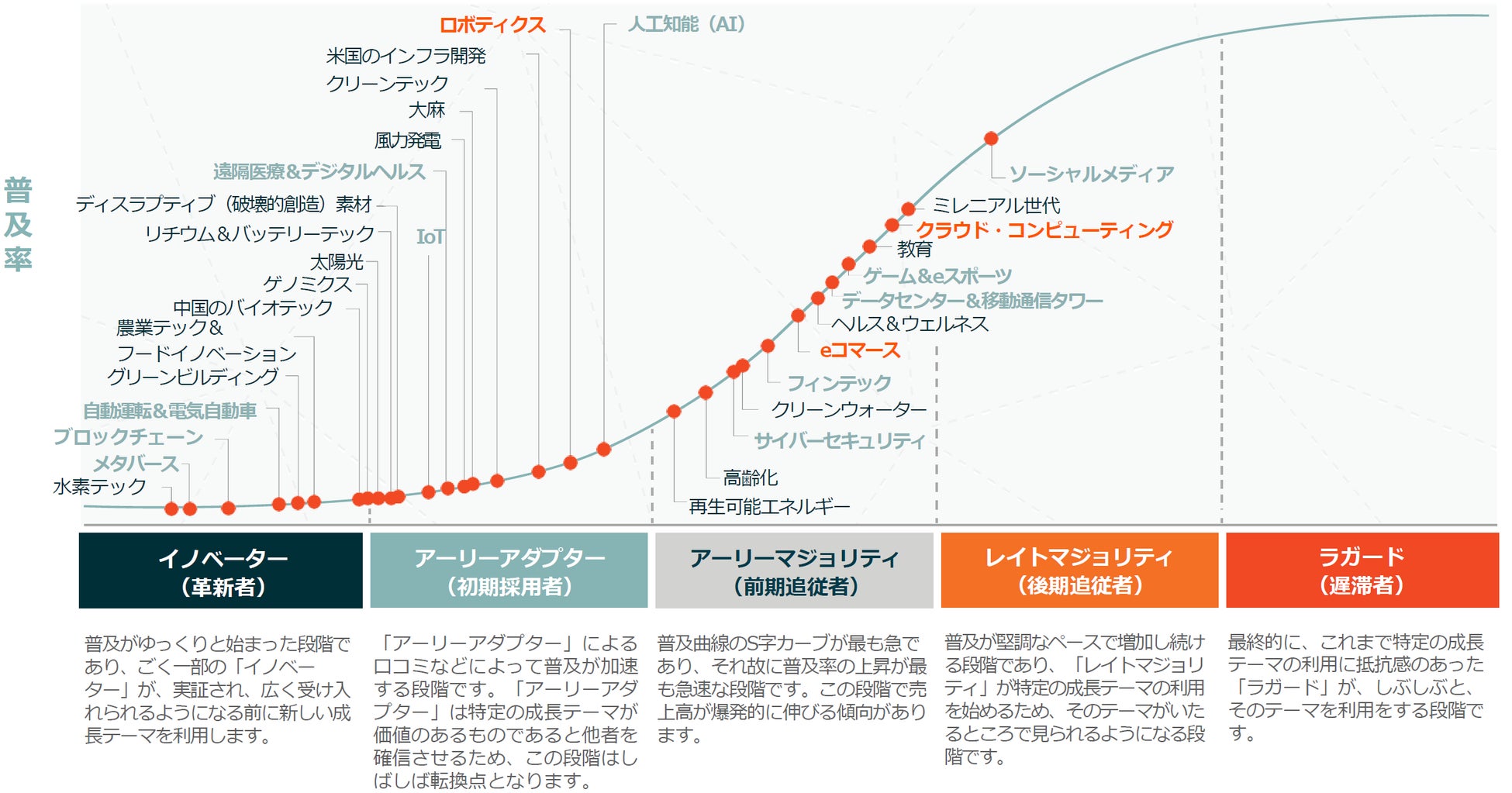 また「コンテンツ/プラットフォーム」「半導体」は普及曲線上の複数の分野に関連しているため、それらの普及により恩恵を受けることが予想されます(図内の太字が関連分野例)。