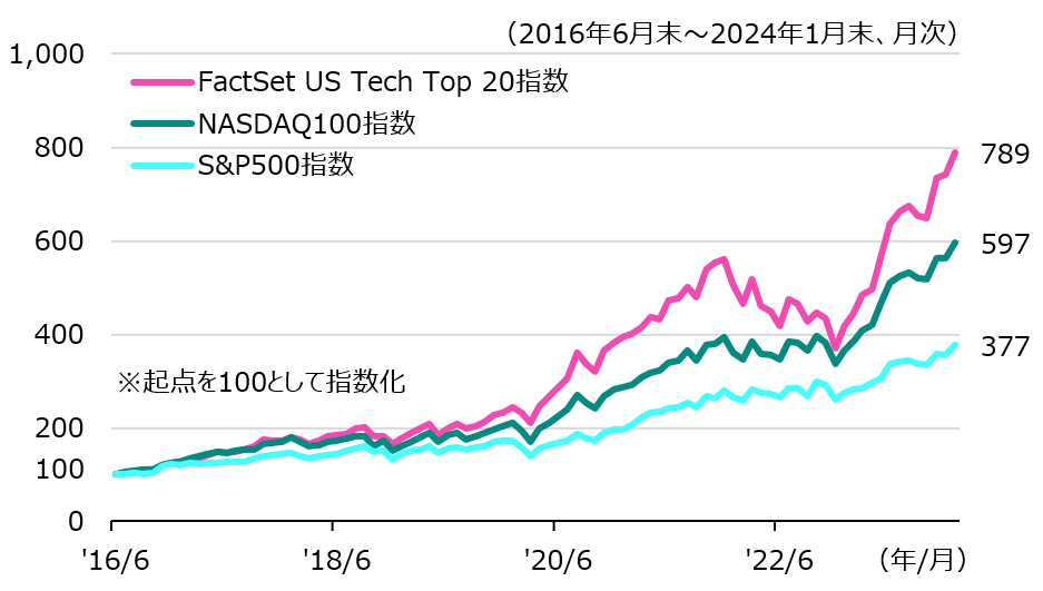 FactSet US Tech Top 20指数と米国主要指数の推移