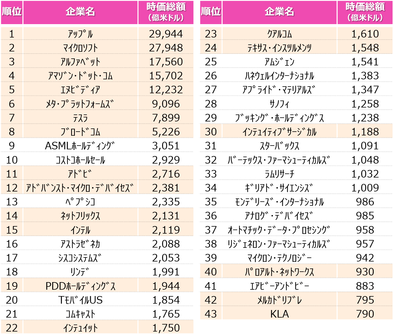 ※2023年12月29日時点、43位までを記載。ハイライトされた銘柄がFactSet US Tech Top 20指数の構成銘柄。