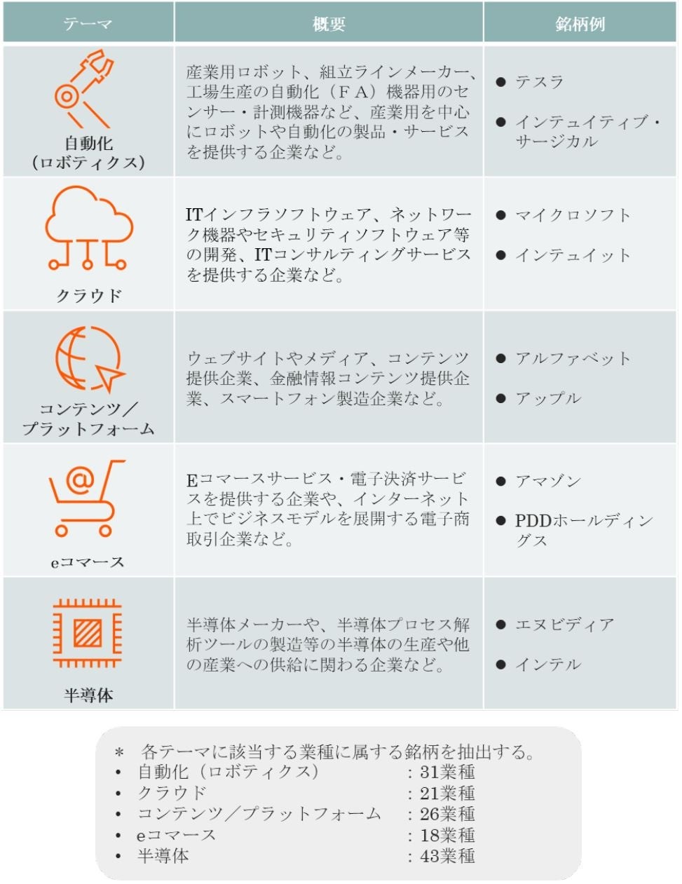 サブテーマに含まれる「ロボティクス」「クラウド」「eコマース」は普及の途上段階であり、今後の成長余地は大きいと推定されます。
