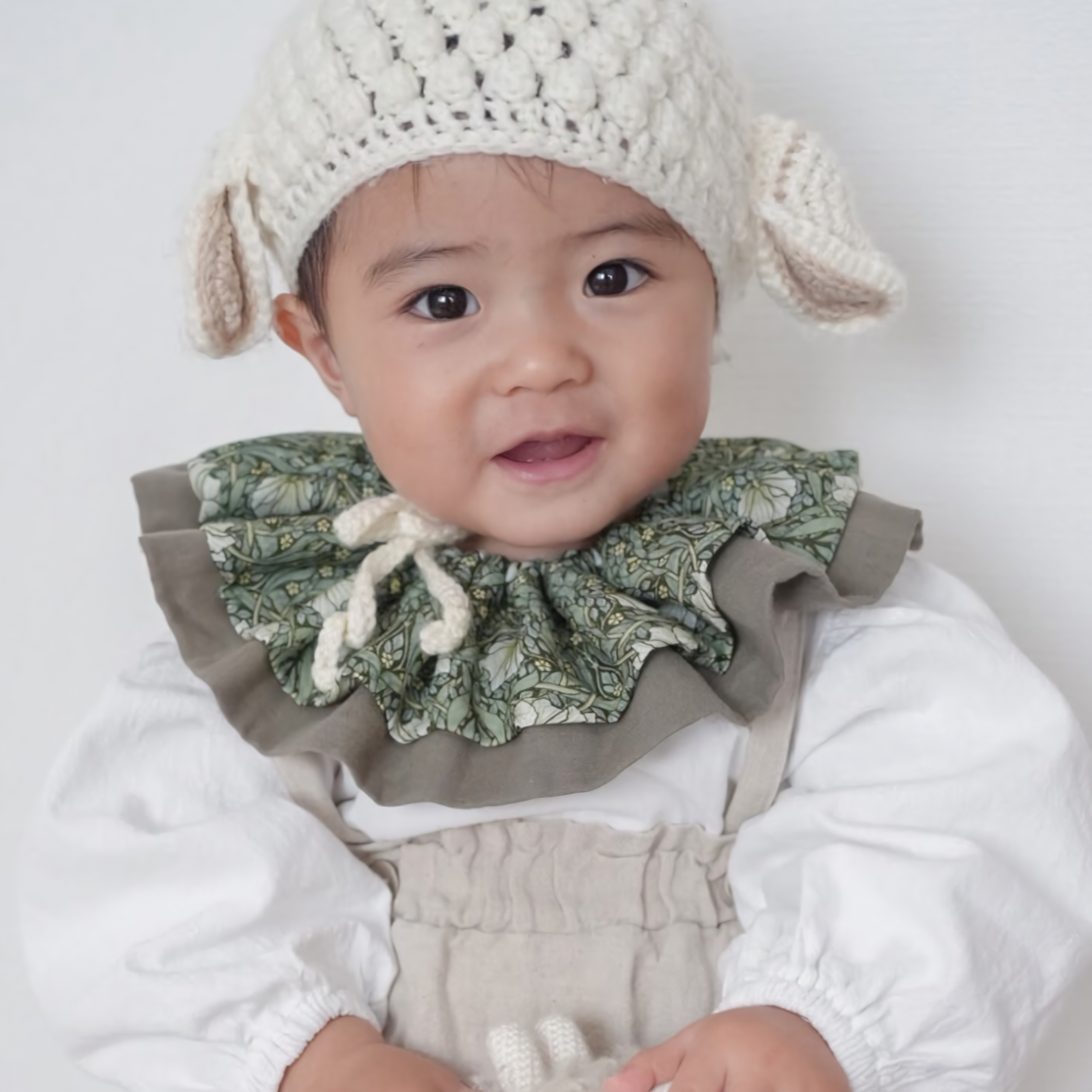 お顔周りを華やかに彩る、贅沢な二重フリルの日本製スタイ。肌に優しいガーゼ素材と淡くやわらかな花柄を組み合わせ、絵画のような愛おしい姿に。ギフトにも最適な洗練アイテムです。