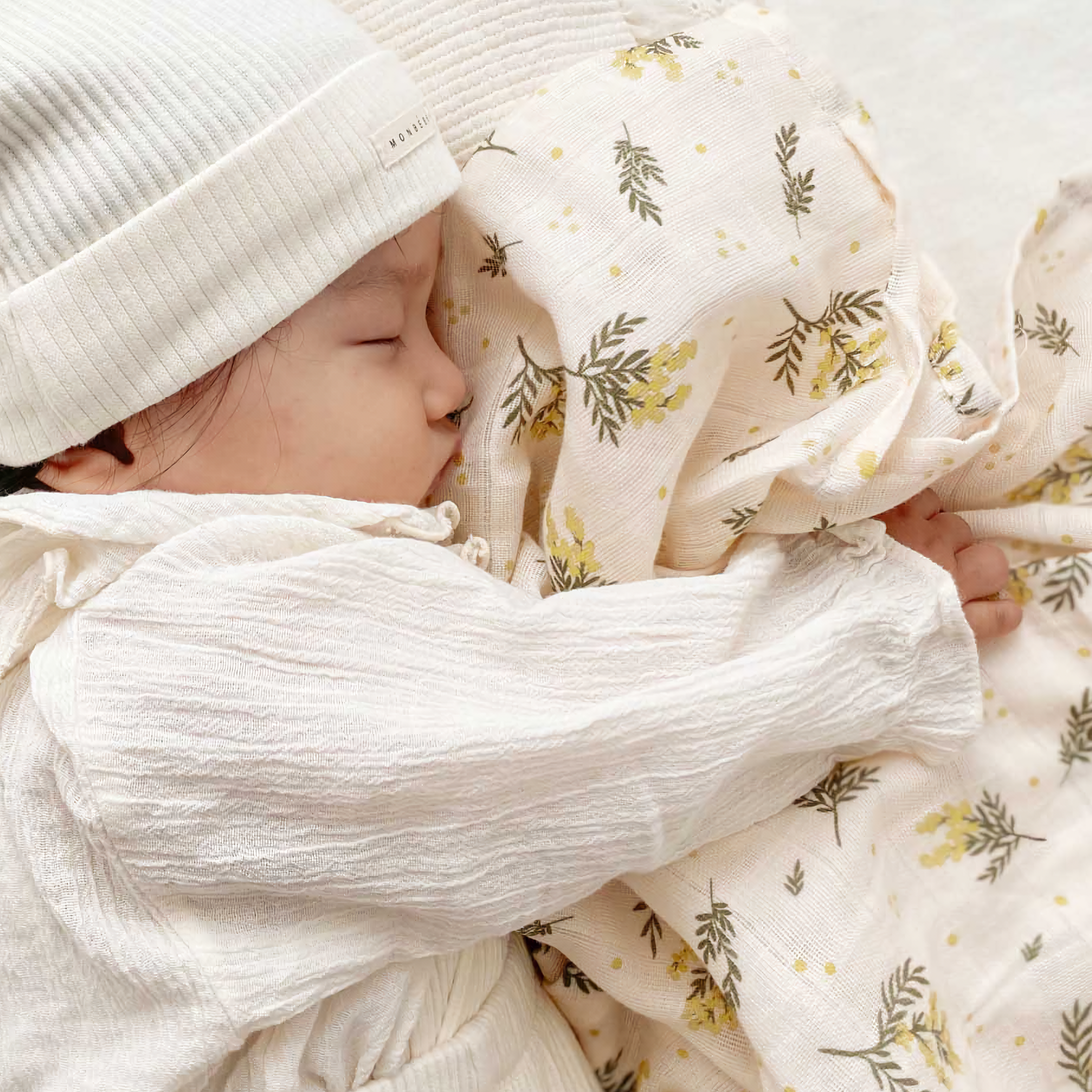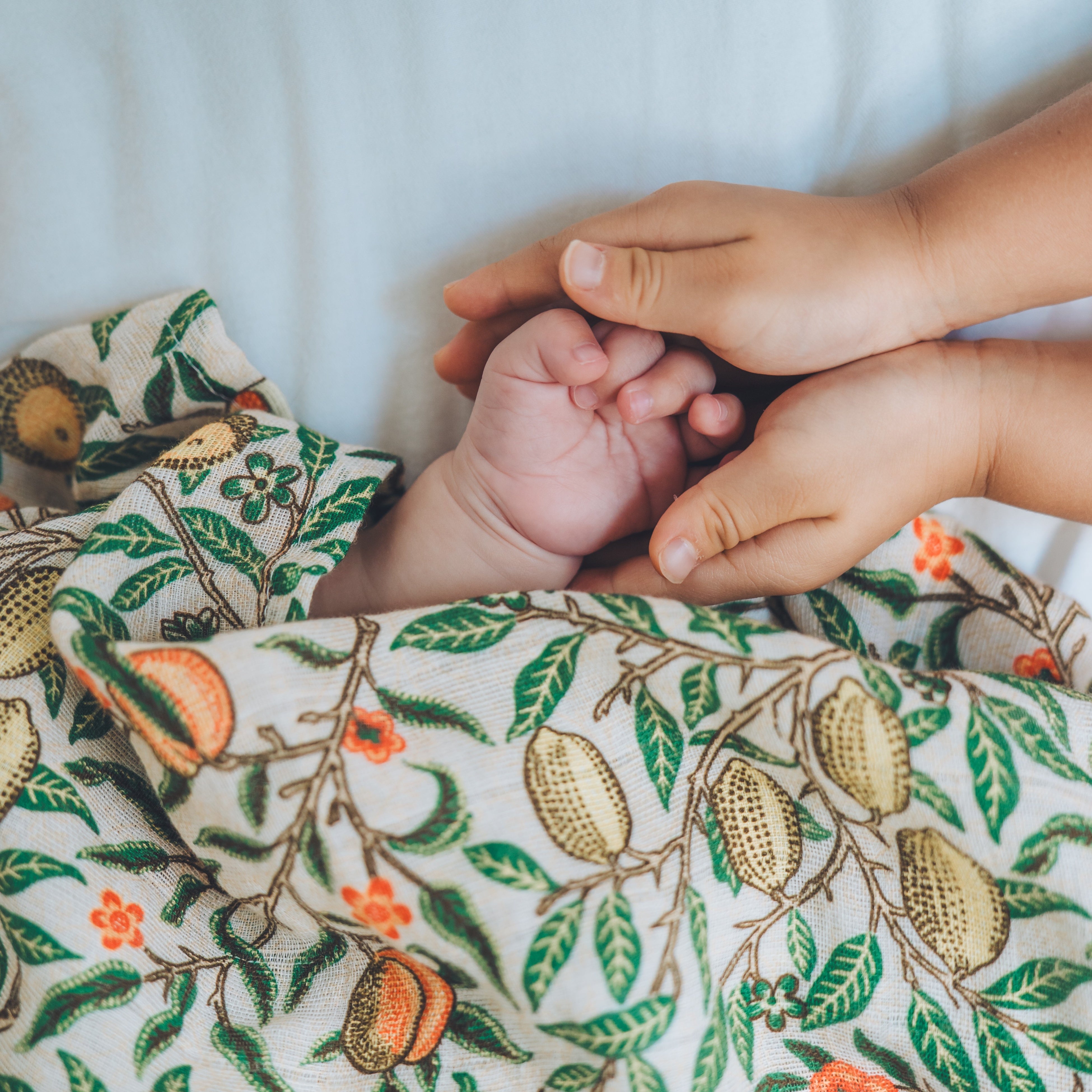 「赤ちゃんに贈るはじめてのアート」として。 ウィリアム・モリスや繊細な花々が彩る、最高級モスリンコットン100%のおくるみ。優しく包み込むたびに心華やぐデザインで、何気ない日常を特別な記念日に変える一枚です。