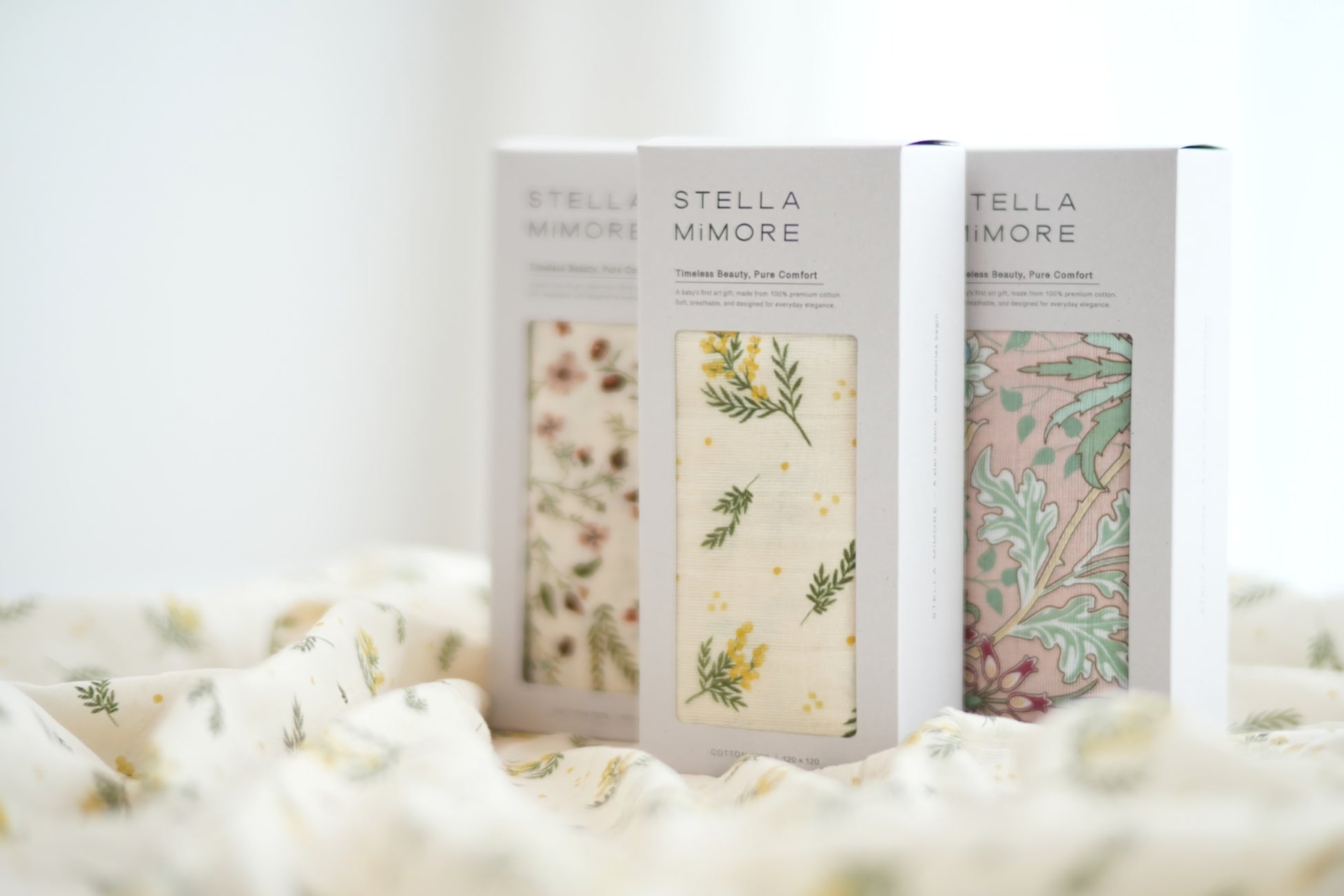 通常オンラインを中心に展開するステラミモアの商品を、実際に手に取り質感や柄を選べる貴重な機会。ウィリアム・モリスのデザインをはじめ、春の訪れを祝うミモザなど、赤ちゃんとの日々にそっと寄り添う「幸せベビーギフト」を厳選してご用意しました。