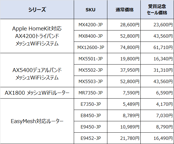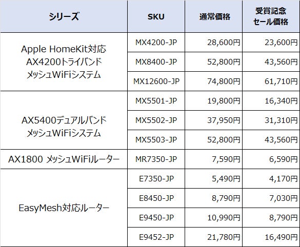 今回の栄誉とお客様への感謝の気持ちを込めて、本日から12月14日まで、受賞記念の特別セールを実施いたします。この受賞期間限定セールでは、あわせてスマホアプリ対応ではありませんが、ご自宅のWiFi環境をお安くアップグレードしたい方にぴったりの、EasyMesh対応WiFi 6ルーターも特別価格でご提供します。