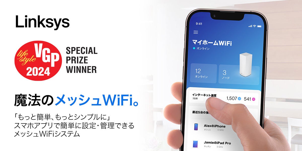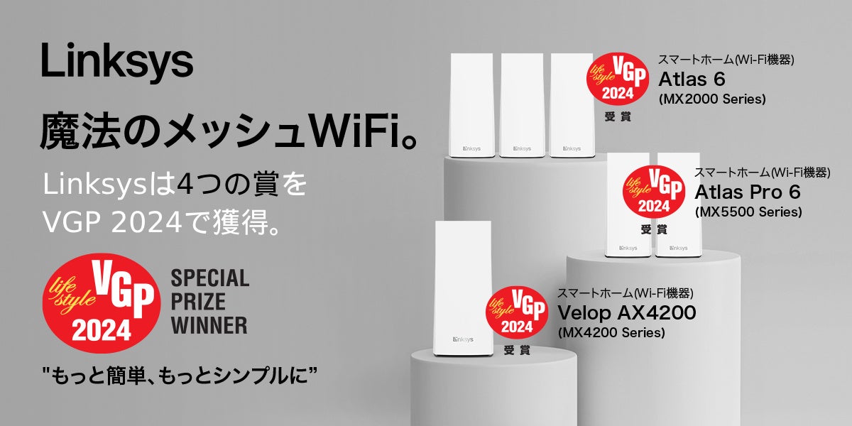 Linksysは、当社製品が日本で名高いVGPアワード2024受賞の運びとなりましたことをここに報告いたします。Intelligent Mesh対応WiFi 6システムがスマートホーム(WiFi機器)カテゴリの部門賞受賞に輝き、スマホアプリで「もっと簡単、もっとシンプルに。」を実現するメッシュWiFiソリューションが特別賞を獲得しました。セキュリティ性と信頼性を兼ね備えたシームレスなWiFiソリューションをお客様に提供する堅実な取り組みが認められた証といえます。