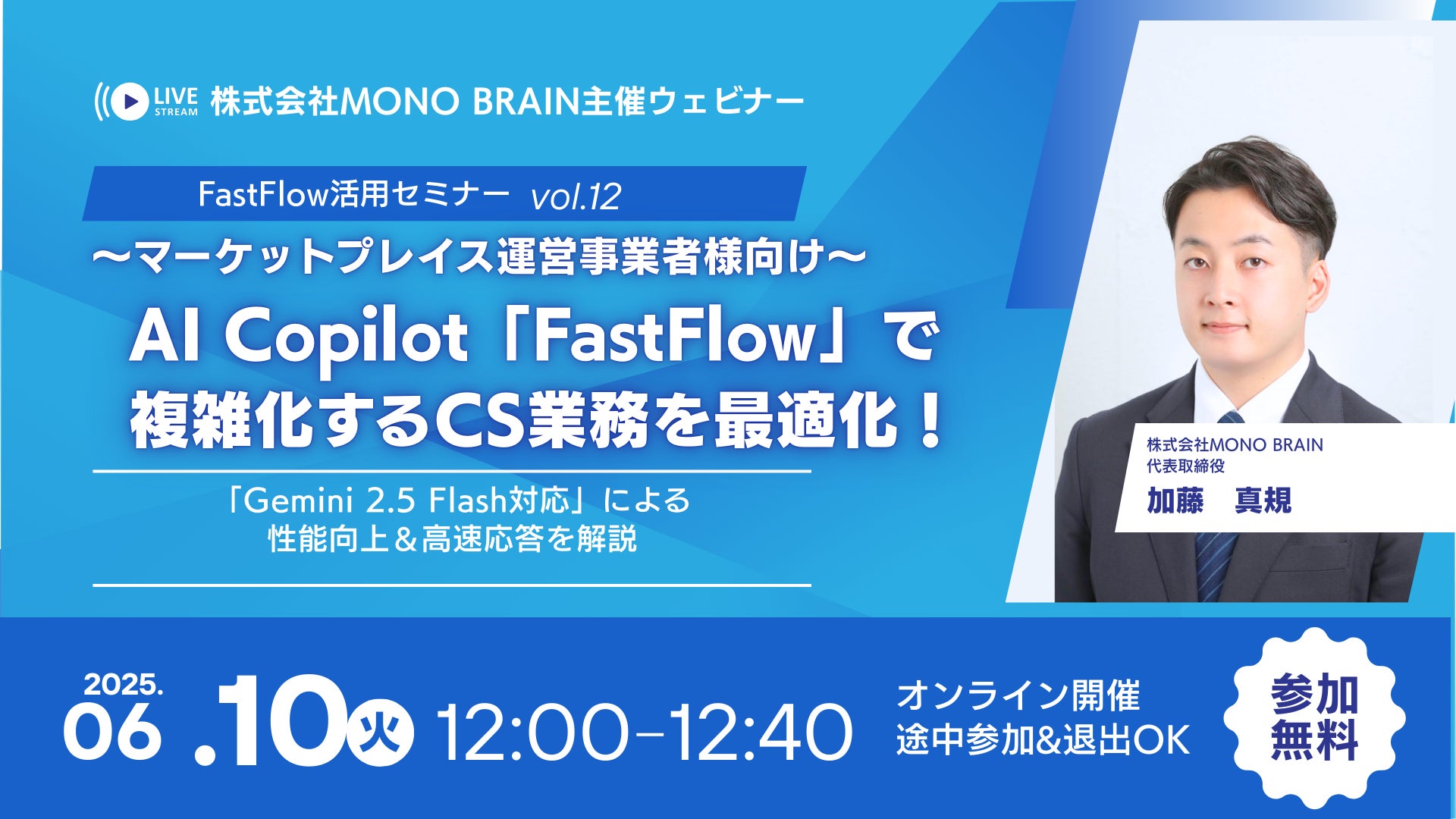 セミナー名: 【6/10開催】マーケットプレイス運営事業者様向け「FastFlow」新機能解説 (vol.12) ~「Gemini 2.5 Flash対応」で性能向上&高速応答を実現!~