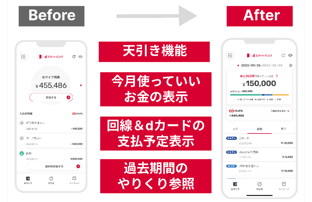 今回のリニューアルにより、お客さまが設定した任意の給料日(任意で設定した集計期間の開始日)を起点として、当月の入出金に加えて、ドコモの回線料金や「dカード®」の支払予定額を自動で集計した残高表示が可能になり、次の給料日までに使っていいお金が一目でわかり、より便利にお使いいただけます。