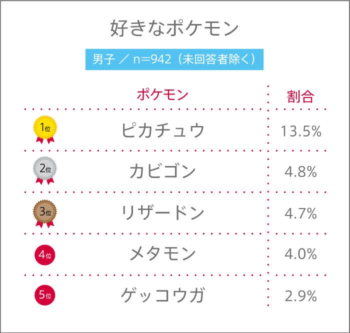男女共通の1位は、アニメ『ポケットモンスター』シリーズに登場する主人公・サトシの相棒“ピカチュウ”。男子は2位に3倍近くの差をつけてのランクインとなりました。