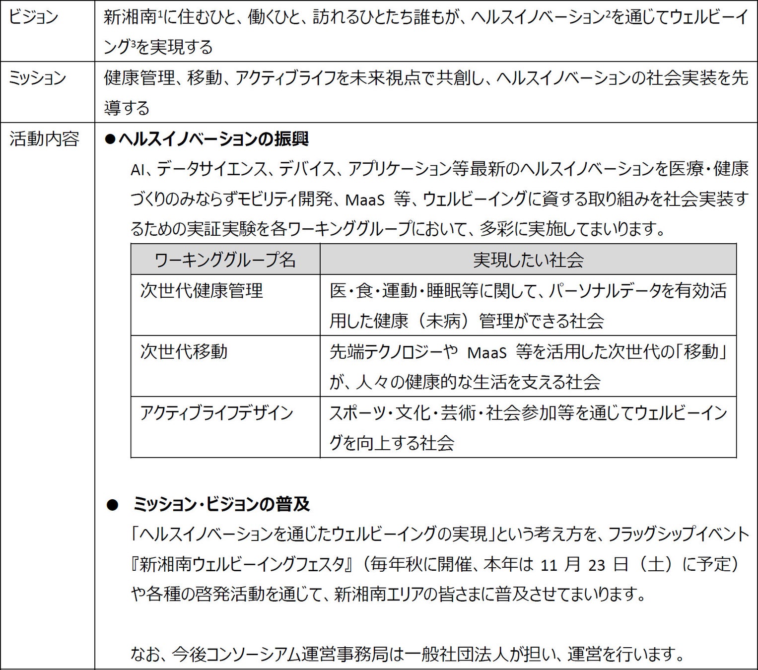 新湘南ウェルビーイングコンソーシアムおよび新湘南ウェルビーイング協議会のビジョン、ミッション、および活動内容等は以下の通りです。