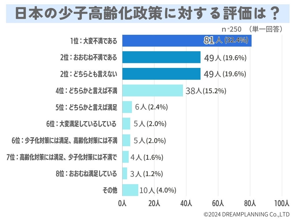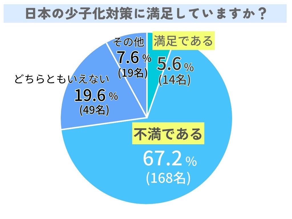 日本の少子高齢化対策について意識調査を行ったところ、「大変不満」と「おおむね不満」で過半数を占める結果となりました。