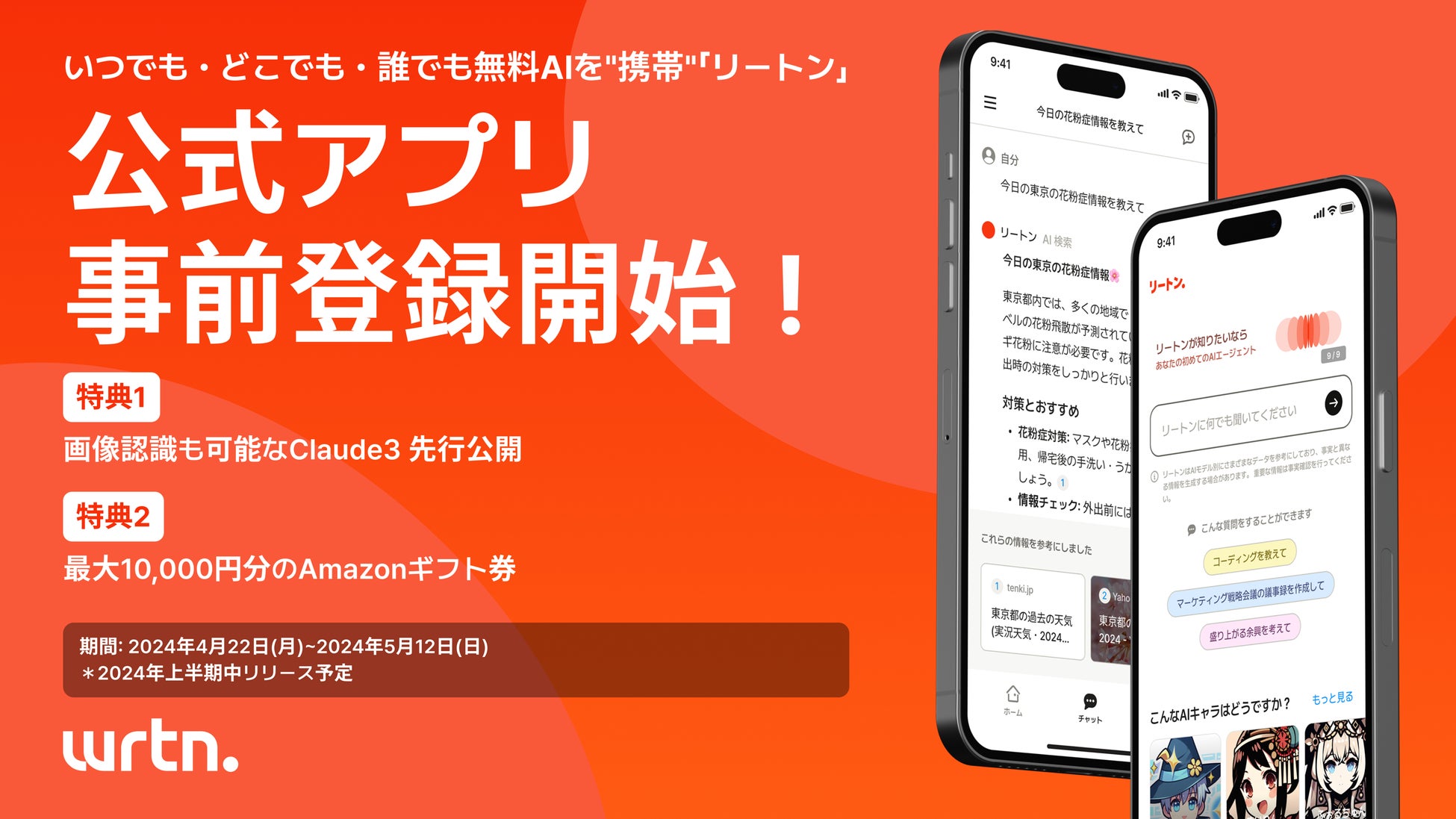 【NEWSRELEASE】“持ち運べるAI” モバイルアプリ 「リートン」 事前登録開始_登録特典として「Claude 3」無料・無制限提供、抽選でAmazonギフト券プレゼント