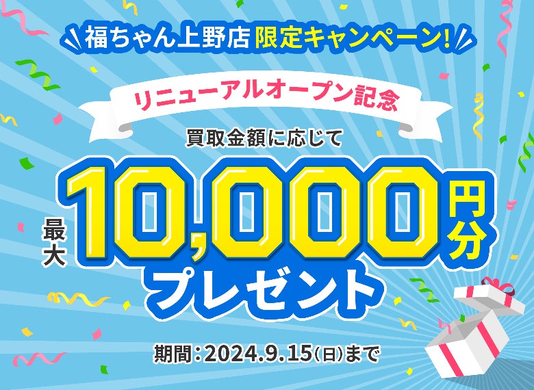 リニューアルオープンを記念して、「福ちゃん 東京 上野店」ではオープン日である2024年8月19日(月)から9月15日(日)までの間、買取金額に応じて最大10,000円分のプレゼントがもらえるキャンペーンを実施します。