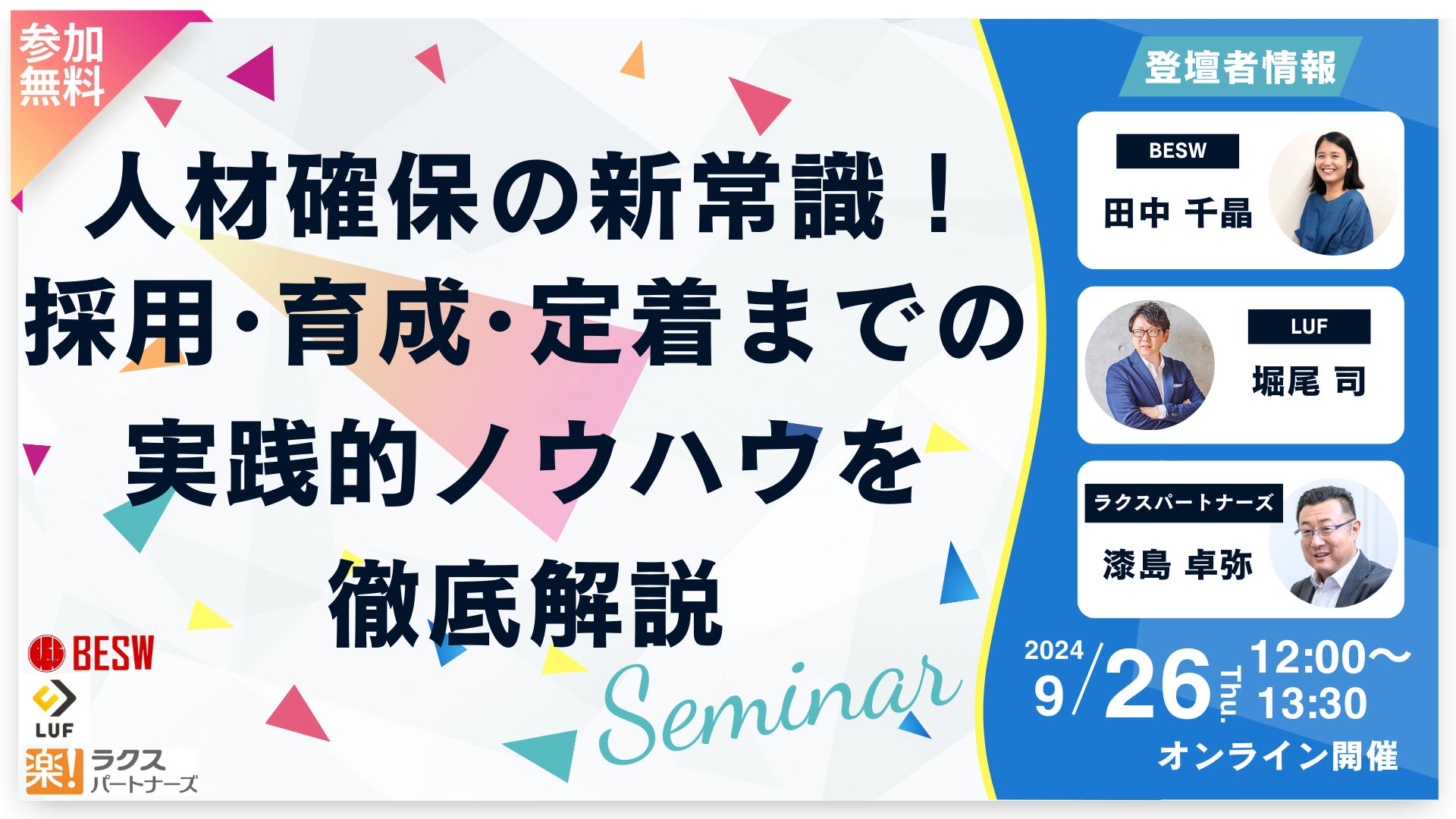 この度、ラクスパートナーズ株式会社様、株式会社BESW様と、「人材確保」をテーマに共催ウェビナーを開催いたします。