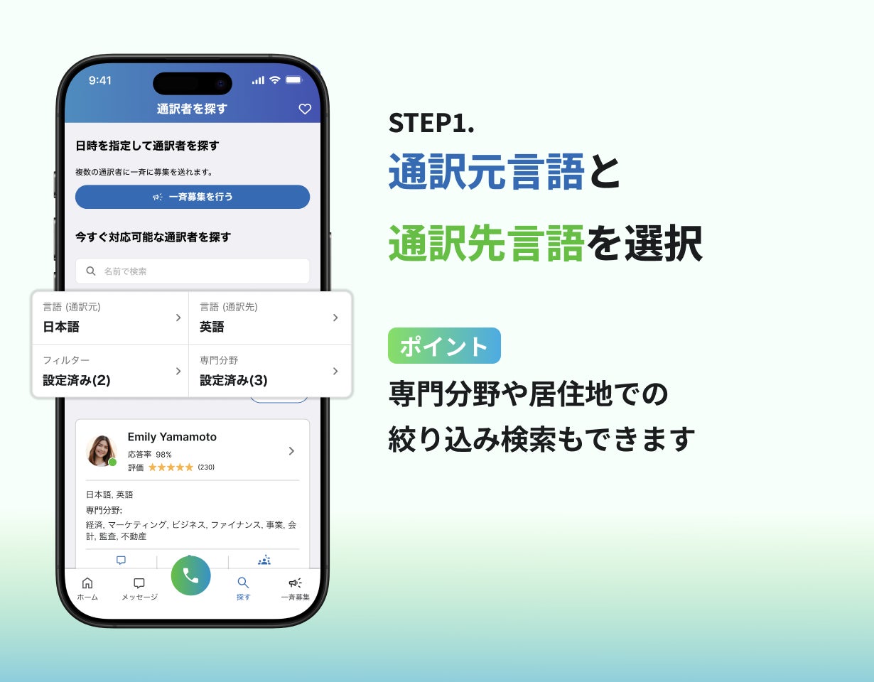 2ステップ、最短5秒で通訳者と繋がることができます。