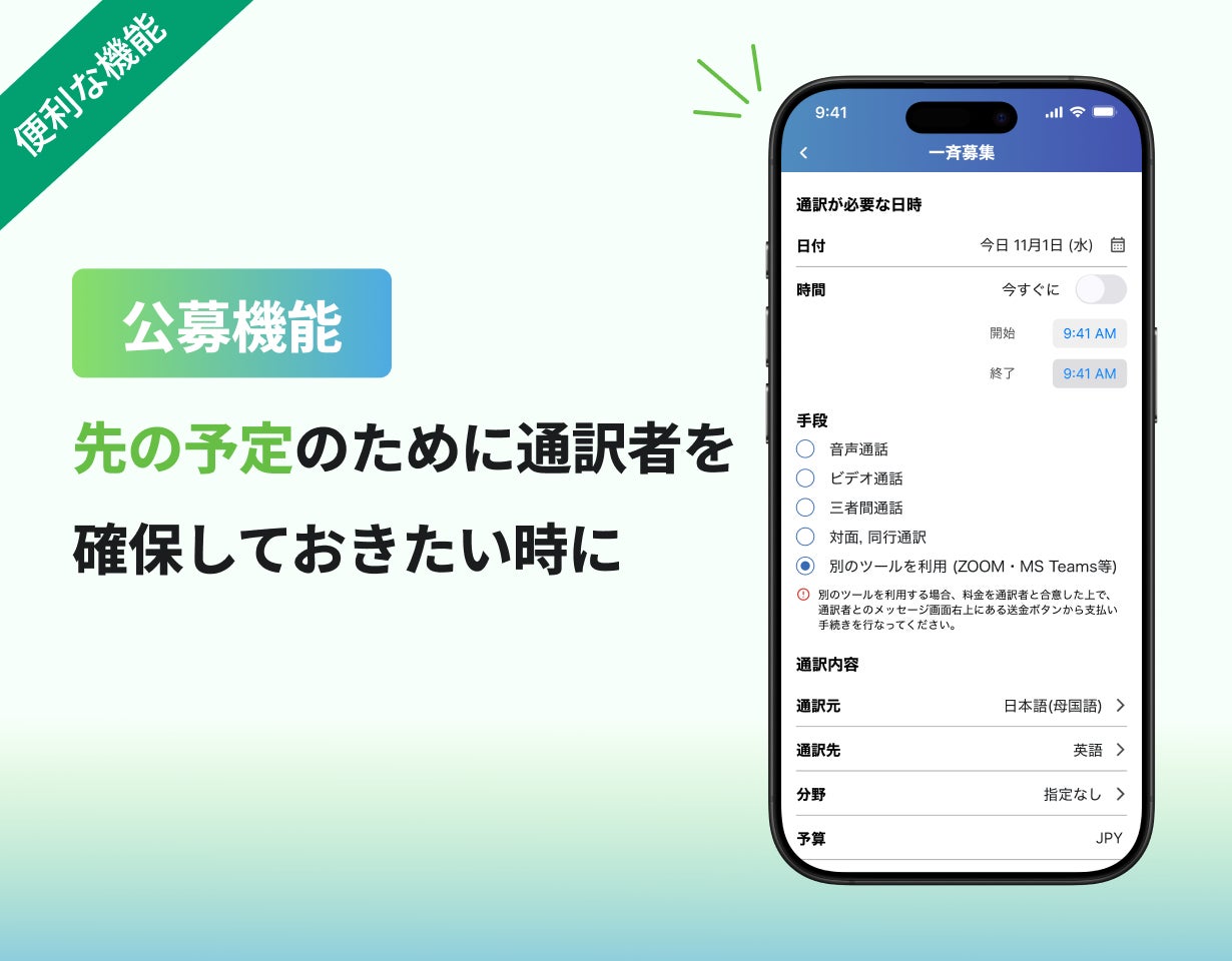 また、先の予定の通訳者を効率的に確保したい場合に重宝する「公募」の機能も備えています。
