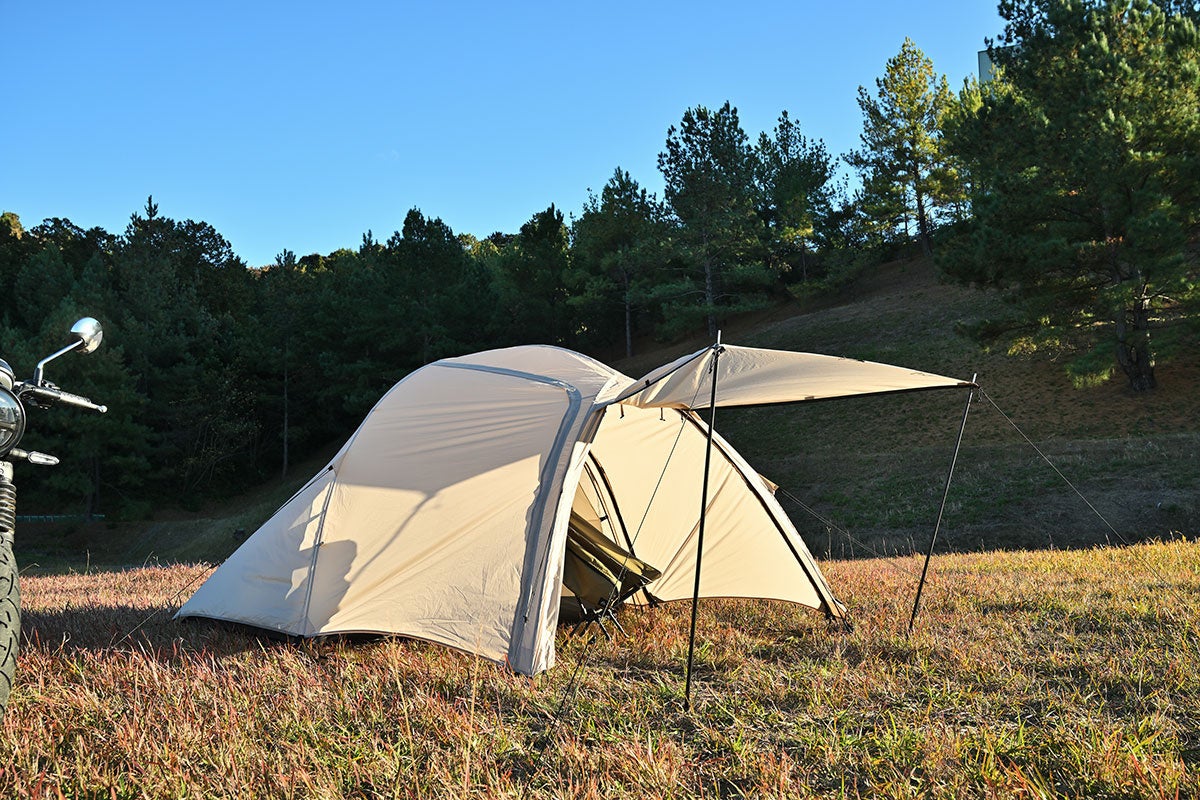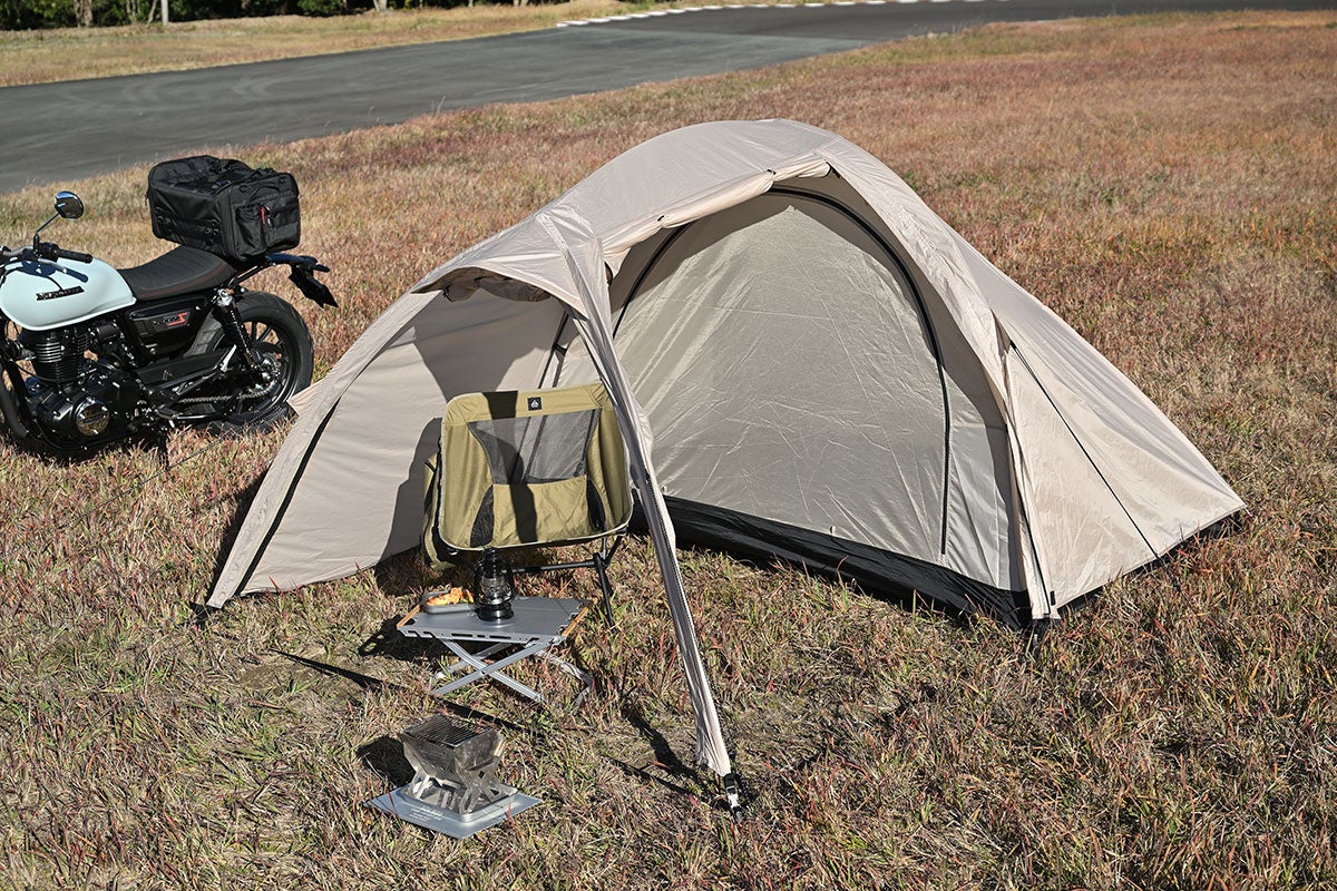 名前の通り、前室の広さが一番の特長です。前室にある3つのパネルを閉じても、ぎりぎり2人が座れるぐらいのスペースがあり、ソロキャンプなら、イスとテーブル、シートバッグを置いても余裕の広さです。キャンプツーリングは車のキャンプと違い、雨が降ったら荷物を一時避難させたり、車の中で過ごしたりできません。テントに前室がなければ、寝袋に入って、テントの中でぼんやり過ごすだけということも。雨の日でもと言うと大げさですが、どんな環境でも楽しくキャンプをしていただきたいですし、前室が広いことでキャンプの楽しみ方もグッと広がるそんなテントです。