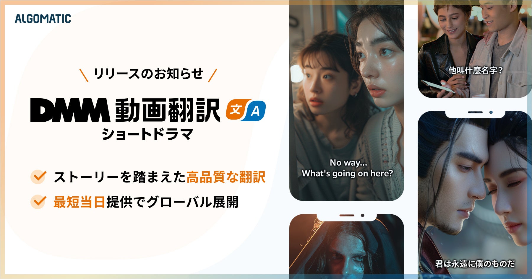 株式会社Algomatic(本社:東京都港区、代表取締役社長:大野峻典、以下Algomatic)は、AI技術を活用したショートドラマ特化型の多言語動画翻訳サービス「DMM動画翻訳 ショートドラマ」を2024年9月17日(火)にリリースしたことをお知らせします。本サービスは、迅速かつ高品質な字幕翻訳を通じて、ショートドラマ配信サービスのグローバル展開を支援します。