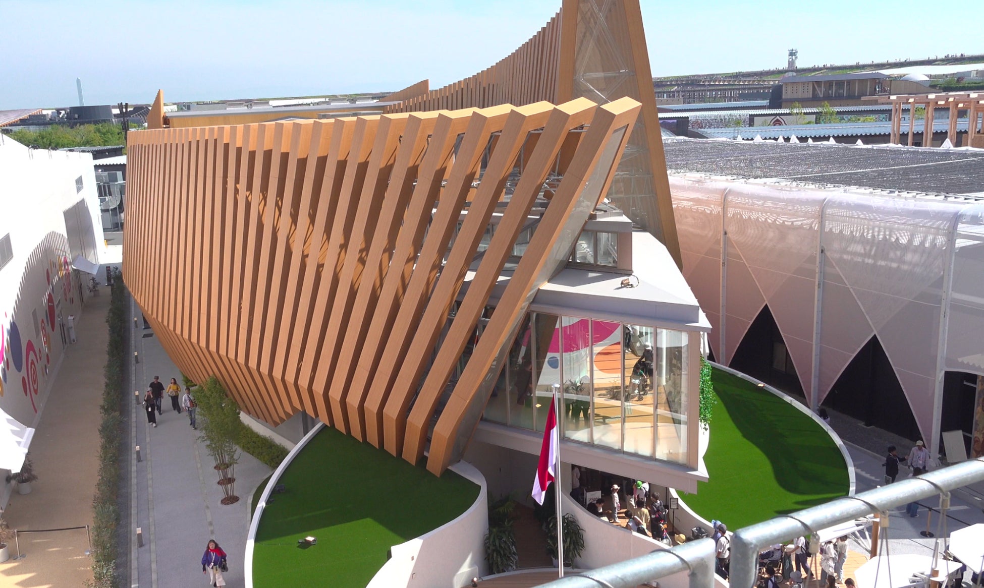 大阪・関西万博において展開されているインドネシアパビリオンは、「調和の中で繁栄する: 自然、文化、未来」をテーマに掲げています。持続可能な開発に挑むインドネシアの姿勢は、パビリオンの象徴である船の意匠に象徴的に表れています。様式美を極めた聳え立つ船の形は、絶えず前進し、成長し、障害を乗り越えて持続的に航行していくという力強いビジョンに象徴される哲学を体現しています。また、建材には米のもみ殻や再生プラスチックを活用した環境配慮型素材「プラナウッド」を使用しており、パビリオン建設における細部にまで持続可能性への配慮が随所に施されています。