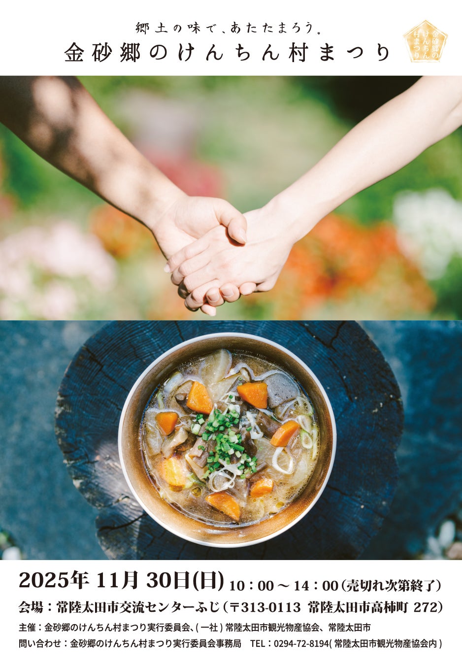 茨城県常陸太田市では、11月30日(日)に「金砂郷のけんちん村まつり」を開催します。郷土の味であたたまりましょう。皆さんお誘いあわせの上ぜひお越しください。