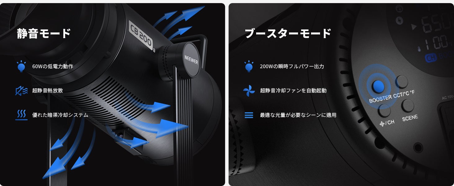12のプリセット照明シーン効果はビデオ作成に人目を引く要素を追加します。約200Wの電力と70,000Lux@1mを提供できるワンボタンブースターモードをサポートし、ファンを自動的にオンにして熱放散を強化します。静音モードは約60Wの電力と30000Lux/1mを提供し、ファンは閉じたままになり、子供やペットの写真撮影に適しています。