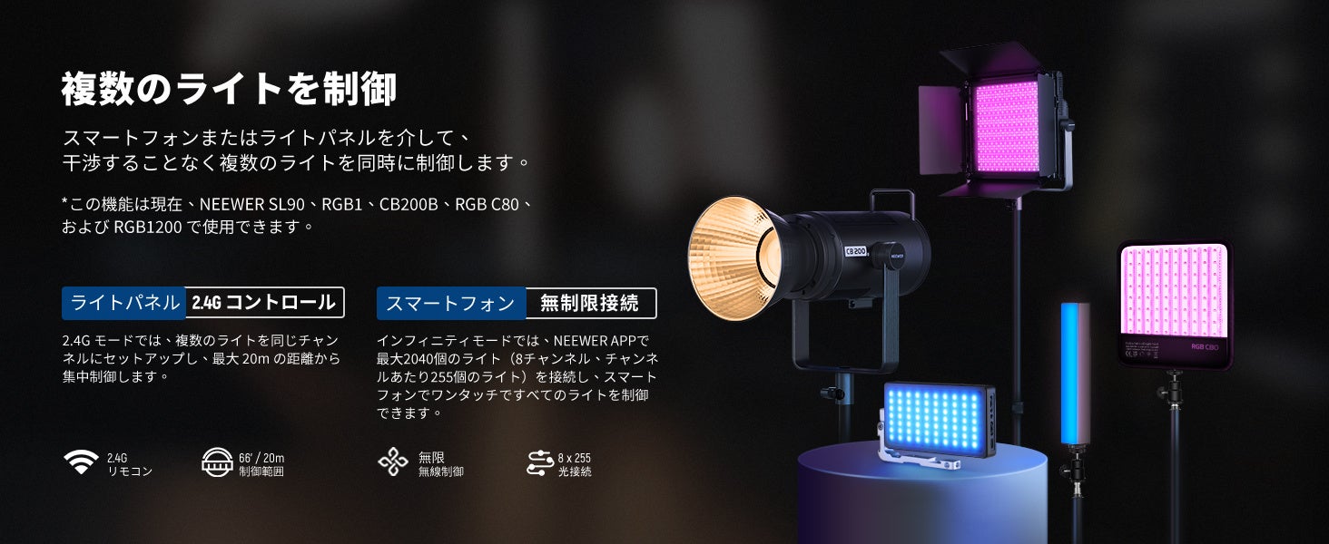 NEEWERインフィニティー接続技術で構成されたNEEWERアプリは、66'/20m以内で同時に複数の照明設定を動的に調整できます。NEEWER SL90、RGB1、RGB C80、RGB 1200、MS60C、MC60B、BH30S、およびCB60Bに対応し、これらのライトには、2.4Gシステムと99 チャンネルが組み込まれており、同じチャンネルに設定して、同時に328'/100以内でリモートコントロールできます。