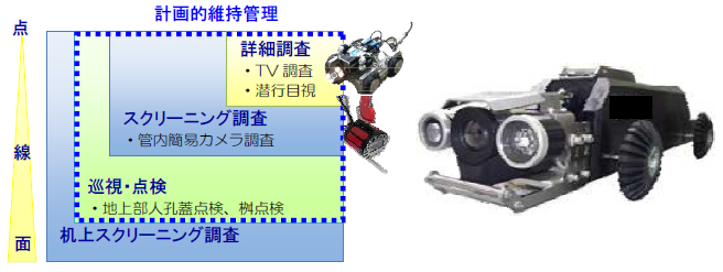 地面の中にあり、すぐに見ることができない下水道管ですが、市内の広い範囲を自走式カメラ等で調べたことによって高精度のデータが得られ、その劣化度を地図上にわかりやすく示したハザードマップができあがりました。下水道管の状態を見える化することができ、効率的で効果的な維持管理が可能となりました。 △管内調査⽤カメラ