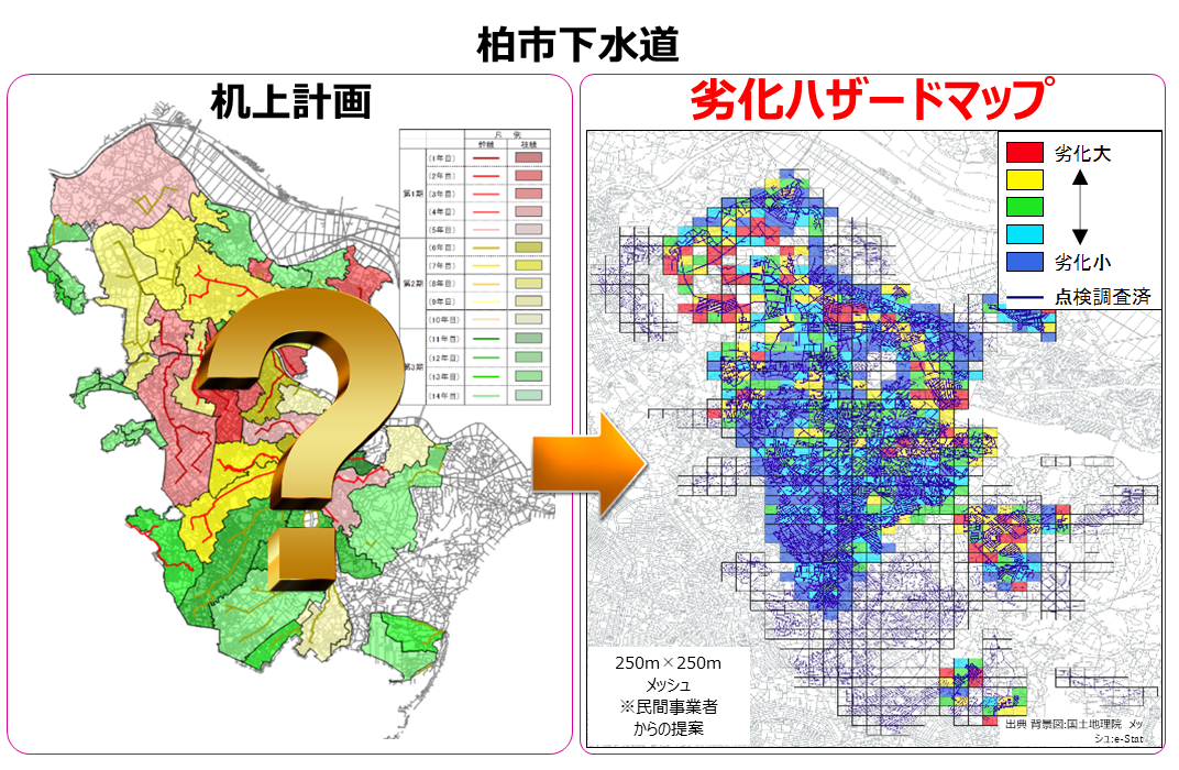 そのひとつが、今回提案する「劣化ハザードマップ」です。ありそうでなかったハザードマップ、誰にでも分かる「見えない下水道管の見える化」、これらのデータを基に老朽化対策を進めます。