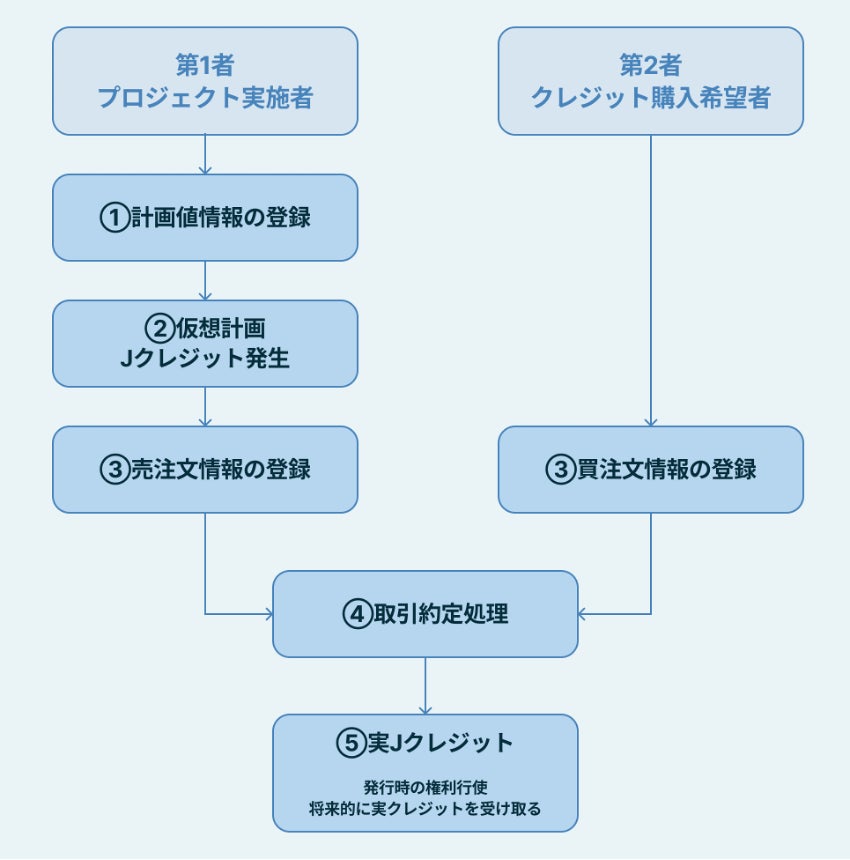 プロジェクト実施者(第1者)とクレジット購入希望者(第2者)の間で、将来発行されるJクレジットの「予約権」の取引を仲介し、約定させることができます。