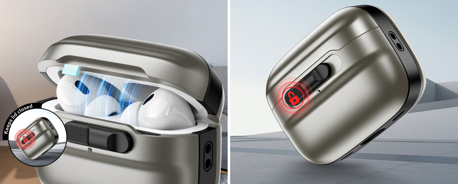 内部ラッチがロックされると磁石がN極-S極で並び、最大限に吸着力で磁気固定されることにより、AirPodsをフタとマグネットの2種類で2重ロックを行うことができます。