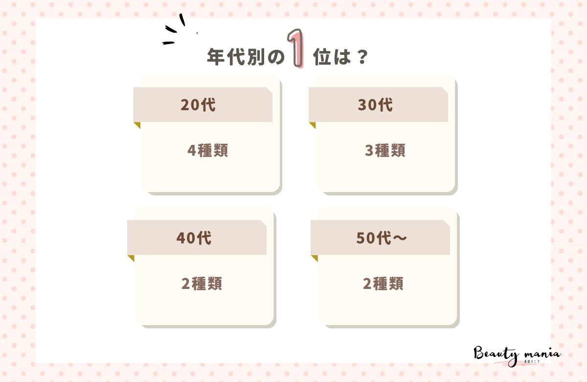 1位の「3種類」を選んだ人の回答として、化粧水+乳液やクリームといった保湿ケアに、シミなどお肌のお悩み用の美容液をプラスして3種類という声が多く見受けられました。