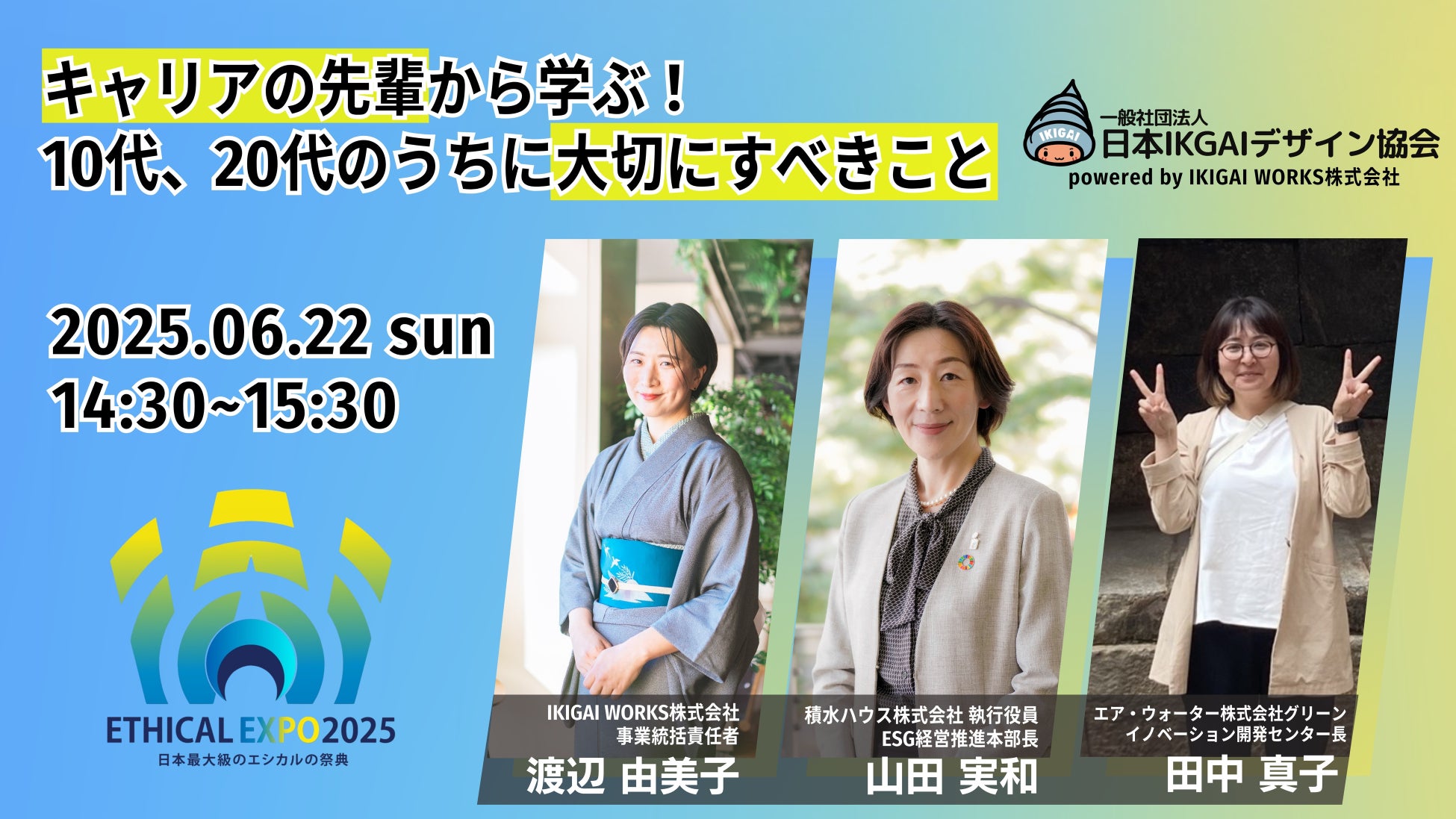 一般社団法人ETHICAL EXPO JAPAN(代表理事:塗野 直透)は、2025年6月21日(土) 、22日(日)にグランフロント大阪北館1階 ナレッジプラザにて、日本最大級のエシカルの祭典「エシカルエキスポ2025 OSAKA」を開催いたします。本イベントスポンサーである「一般社団法人日本IKIGAIデザイン協会」がプロデュースした、2つのトークセッションがステージにて行われます。