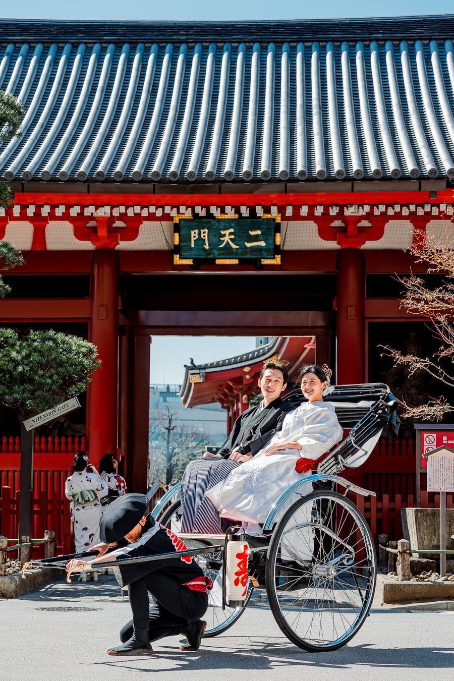 3. 人力車ツアー:スタジオ前まで人力車がお迎えに。浅草の歴史と文化を感じながら、撮影スポットへと向かいフォトグラファーによるロケーション撮影スタート
