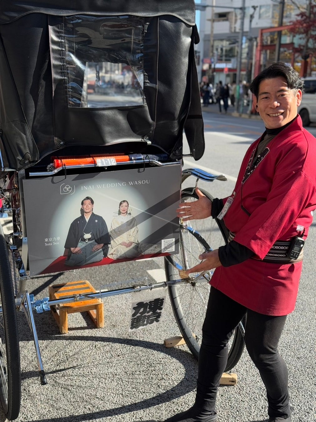 浅草の観光人力車「東京力車」(株式会社ライズアップ)と、和装前撮り専門セルフ写真館「INAI WEDDING WASOU」(株式会社ワールドマップ)がタッグを組んだ「浅草人力車ロケーション撮影プラン」本プランの認知拡大を目的に、現役俥夫をモデルにした特別仕様の人力車看板を掲載を開始いたします。