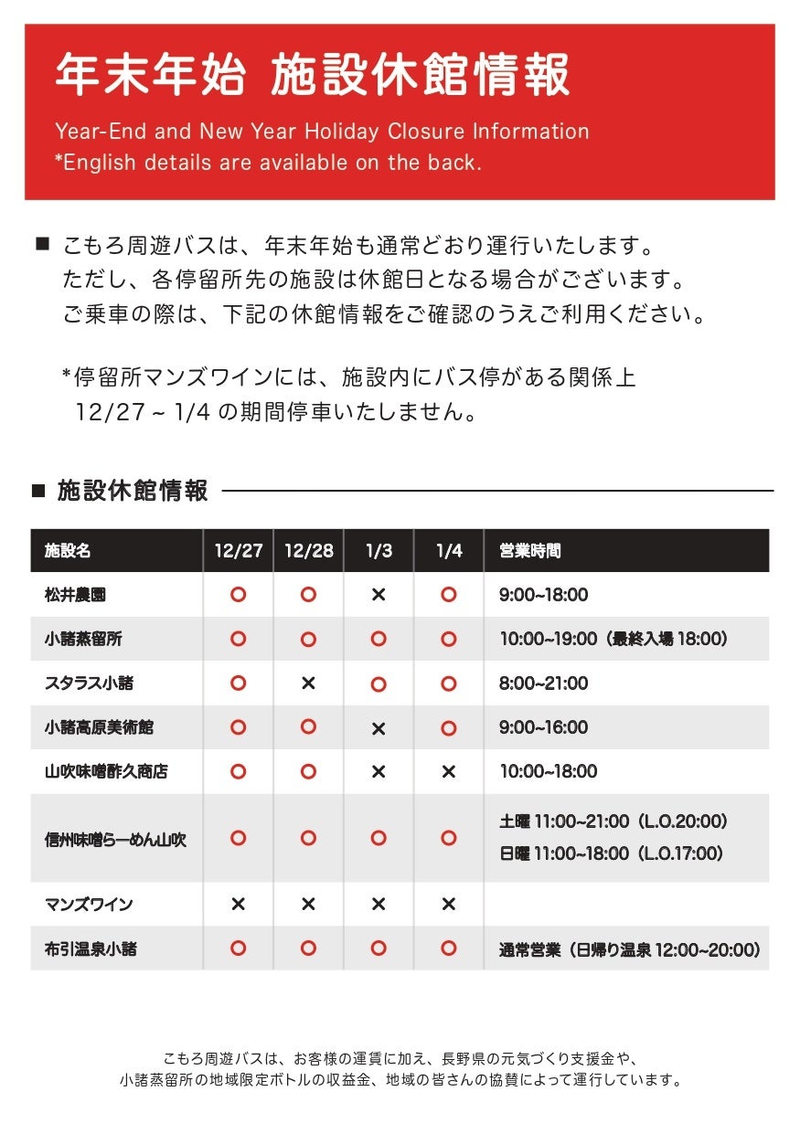 乗り降り自由で市内の観光スポットを巡る「こもろ周遊バス」は、下記の年末年始期間も休まず運行いたします。