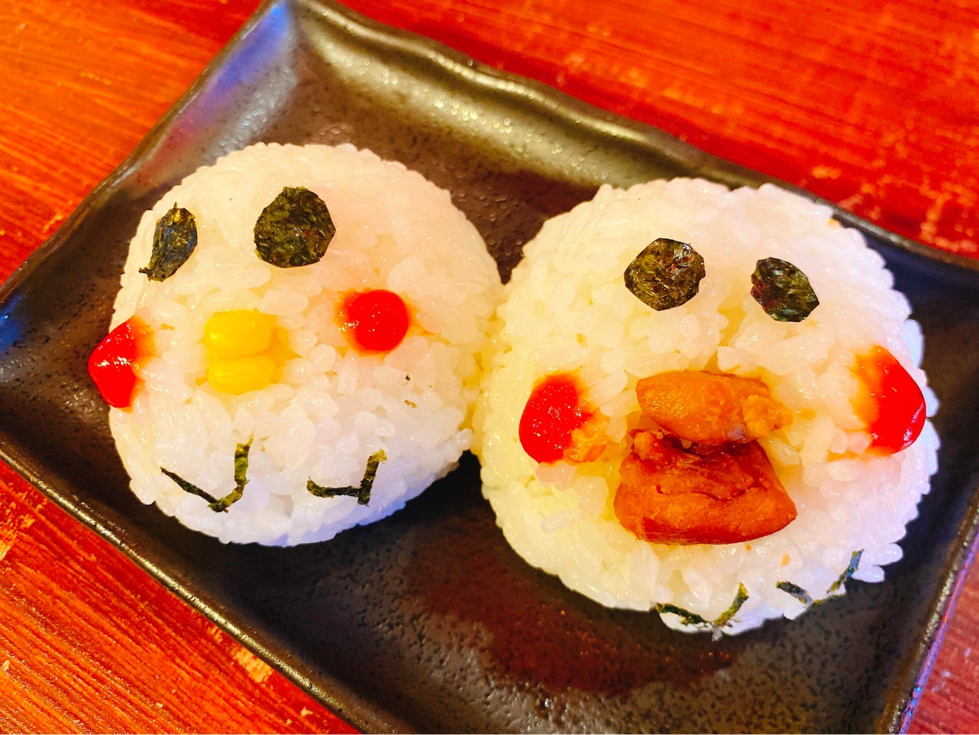 ひよこをイメージしたかわいいおにぎり(1皿2個)。くちばしはコーン(左)と佃煮(右)です。おにぎりの中には、片山鳥肉店特製の唐揚げが入っており、お子様でもおいしく召し上がれます。