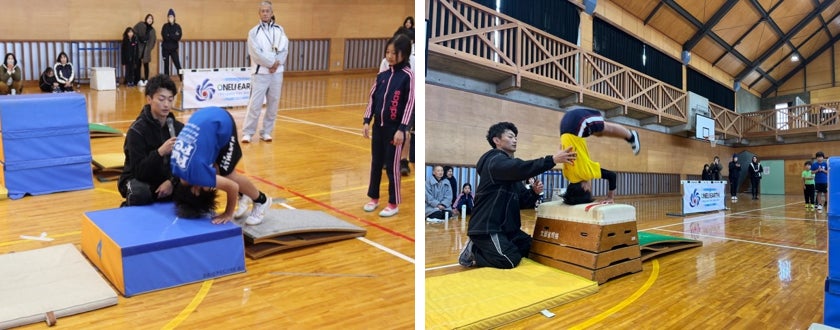 亀山氏による飛び箱を使ったあん馬のデモンストレーションでは、会場から驚嘆の声が上がりました。子どもたちは前転・後転などの基礎的な運動を習得し、より難易度の高い技にも果敢に挑戦しました。見学していた教員からは、「体育の授業とは違う指導法でとても勉強になった」「ちょっとしたコツを掴むことで、子どもたちがどんどん上達していくのが驚きだった」といった声が寄せられました。