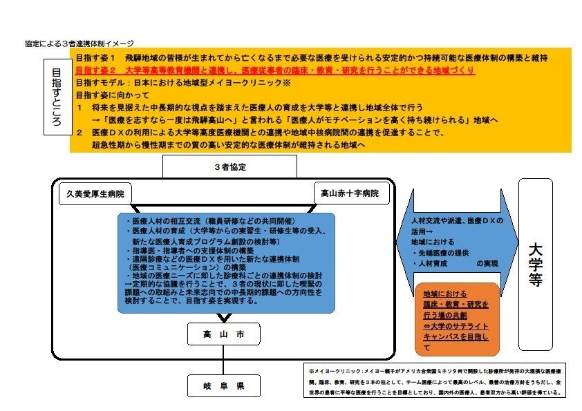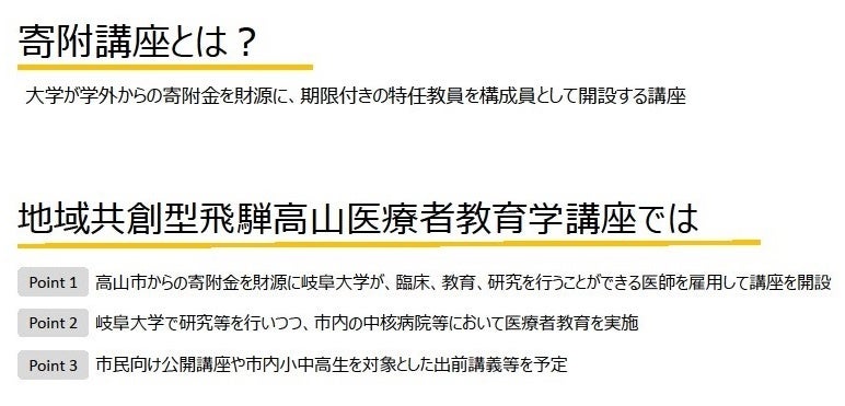 本事業は、市内総合病院である高山赤十字病院、久美愛厚生病院、高山市の3者による連携協定に基づき、岐阜大学大学院医学系研究科に寄附講座を開設し、診療、教育、研究ができる人材(医師)が岐阜大学と高山市を行き来し、最先端の医療者教育を展開するとともに、市民向けの公開講座や生徒を対象とした出前講義を実施することにより、飛騨高山の将来の地域医療を担う医療人材の育成・確保を目指すものです。