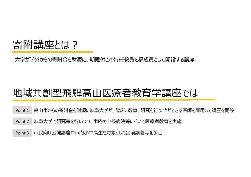 大学が学外からの寄附金を財源に、期限付きの特任教員を構成員として開設する講座で、今回の「地域共創型飛騨高山医療者教育学講座」には以下の3つのポイントがあります。