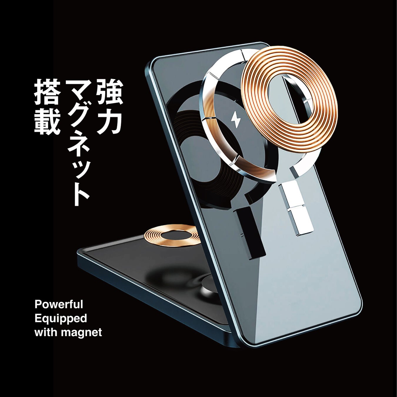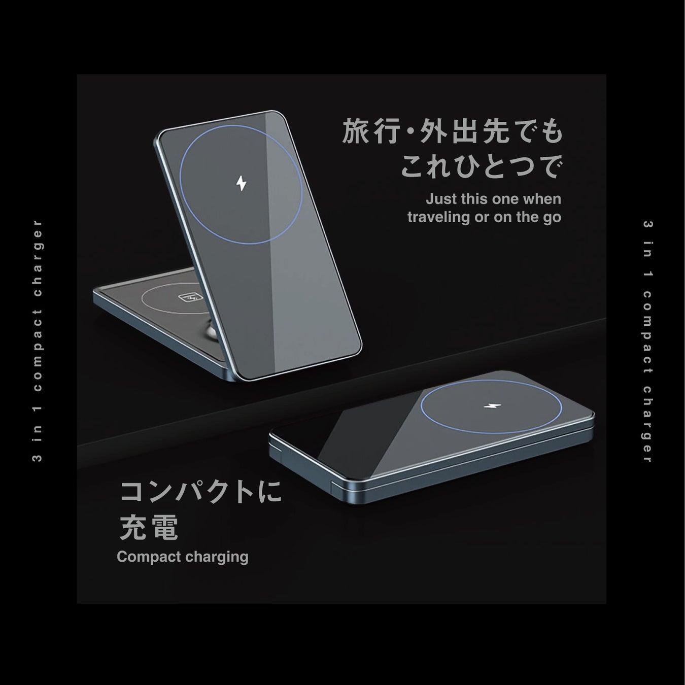 本製品は、マグセーフ対応のスマートフォン、イヤフォン、ウォッチの3デバイスを同時にまとめて充電します。