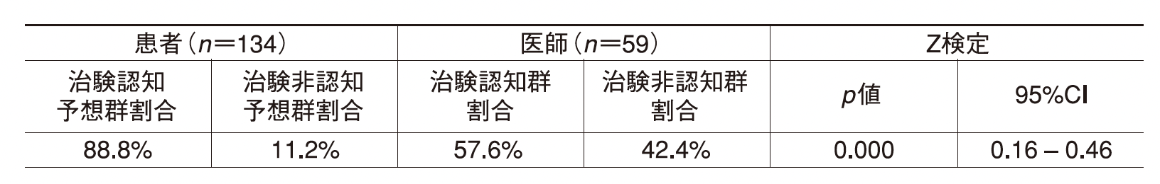 患者さんの88.8%が「主治医は治験を認知している」と予想したのに対し、実際に「治験を認知している」と回答した医師は57.6%にとどまり、「ほぼ知らない」が42.4%に上りました。医師の治験認知度は、患者が予想するよりも有意に低く、両者の間に顕著なギャップが認められました(p=0.000,95%CI:0.16‒0.46)。